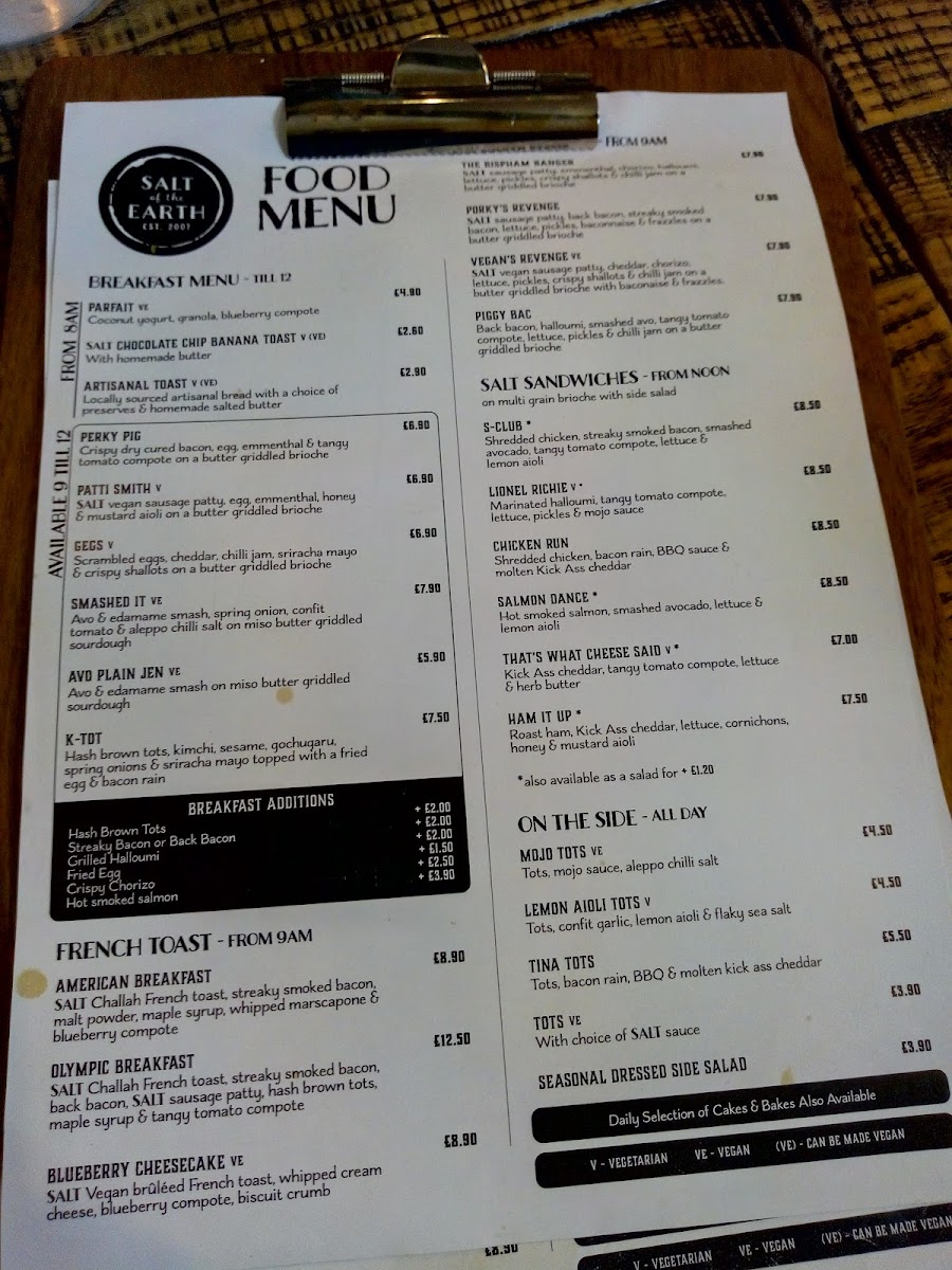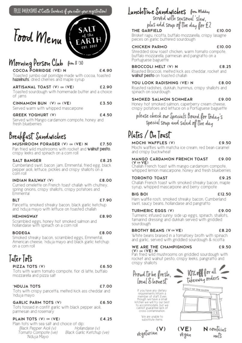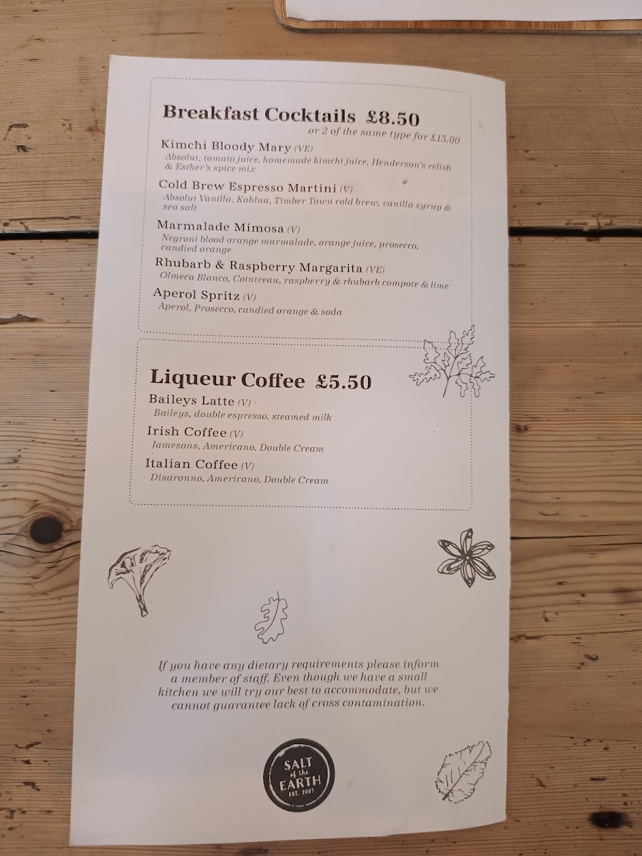 The menu at Salt of the Earth offers a vibrant and eclectic selection that caters to a variety of tastes, making it a standout choice for breakfast, brunch, or lunch. For those looking for a lighter start, the Little Breakfast options like Sourdough Toast and Banana Bread pair perfectly with indulgent treats such as the Cinnamon Bun. Moving on to heartier choices, Breakfast Bagel and The Devilled Egg Wears Prada stand out among the sandwiches, while the Tots Monsieur and Tot Stuff are perfect for a savory snack. The restaurant also serves up creative dishes like Toronto Toast and Super Kimchi Boy under the Toast & Friends section, as well as Pizza Tots and Garlic Parm Tots in the Tater Tots category. If you're in the mood for a cocktail, there’s something for every palate, from the spicy Kimchi Bloody Mary to the refreshing Rhubarb & Raspberry Margarita. For a cozy pick-me-up, the coffee menu offers Flat White and Matcha Latte With Oat, while tea enthusiasts can enjoy the Born Wild Loose Leaf Tea. The more indulgent options, such as the S'mores Hot Chocolate or a comforting Irish Coffee, round out the drink selection. For lunch, the Chicken Parmo and Broccoli Melt provide comforting choices, while the Mortadella Versace sandwich offers a touch of sophistication. Lastly, the variety of plates and boards, including Burrata and the Salt Charcuterie B, present a more refined option for those looking to share. The playful yet sophisticated menu at Salt of the Earth brings a little something for everyone, ensuring no one leaves disappointed.