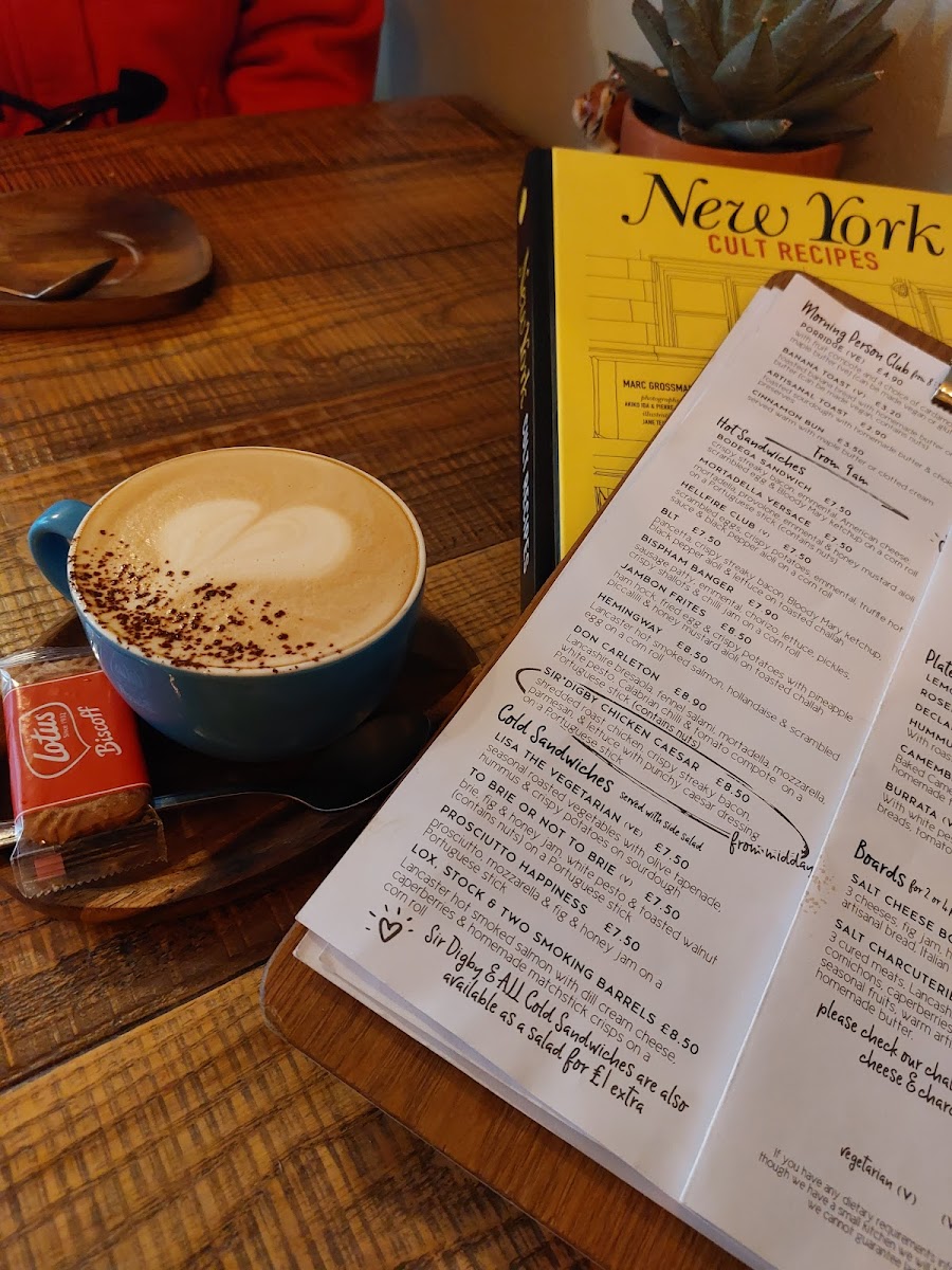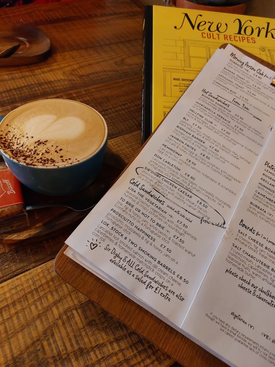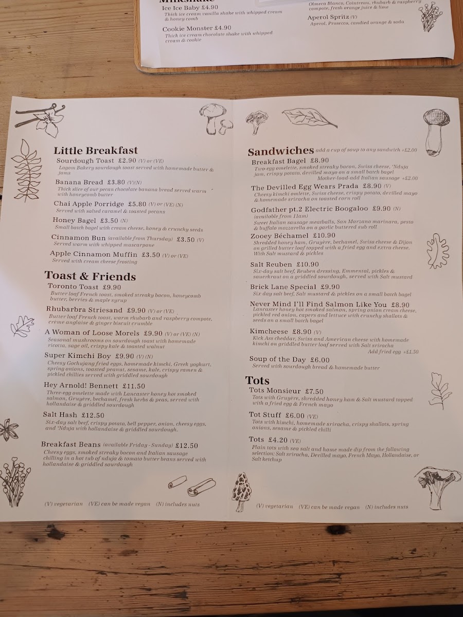 The menu at Salt of the Earth offers a vibrant and eclectic selection that caters to a variety of tastes, making it a standout choice for breakfast, brunch, or lunch. For those looking for a lighter start, the Little Breakfast options like Sourdough Toast and Banana Bread pair perfectly with indulgent treats such as the Cinnamon Bun. Moving on to heartier choices, Breakfast Bagel and The Devilled Egg Wears Prada stand out among the sandwiches, while the Tots Monsieur and Tot Stuff are perfect for a savory snack. The restaurant also serves up creative dishes like Toronto Toast and Super Kimchi Boy under the Toast & Friends section, as well as Pizza Tots and Garlic Parm Tots in the Tater Tots category. If you're in the mood for a cocktail, there’s something for every palate, from the spicy Kimchi Bloody Mary to the refreshing Rhubarb & Raspberry Margarita. For a cozy pick-me-up, the coffee menu offers Flat White and Matcha Latte With Oat, while tea enthusiasts can enjoy the Born Wild Loose Leaf Tea. The more indulgent options, such as the S'mores Hot Chocolate or a comforting Irish Coffee, round out the drink selection. For lunch, the Chicken Parmo and Broccoli Melt provide comforting choices, while the Mortadella Versace sandwich offers a touch of sophistication. Lastly, the variety of plates and boards, including Burrata and the Salt Charcuterie B, present a more refined option for those looking to share. The playful yet sophisticated menu at Salt of the Earth brings a little something for everyone, ensuring no one leaves disappointed.